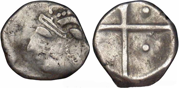 Obverse: Helmeted head facing left, helmet decorated