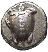 Aegina (Aigina) is an island in Saronic Gulf located off southeastern Greece. Island was settled by Dorians around 900 BCE. Aegina was named after the daughter of Greek river god Asopos. First Greek coins were believed to be made in Aegina around 595 BCE. Island of Siphnos in the Aegean sea was believed to be the source of silver for making Aeginetan coins. Aegina was an independent City State in the 6th century BCE with great maritime trade and tradition. Aegianetans probably chose sea turtle as the symbol on the coins reflecting their maritime history. These Aeginetan chelones also known as turtles had a wide circulation in the mediterranean region till owls of Athens slowly displaced them as a standard coins in the late 5th century BCE. In 4th century BCE, Aegianetans changed design on their coins from Sea turtle to land dwelling Tortois. Some scholars ascribe this change to loss of supremacy of sea trade by the islanders to other greek City States.