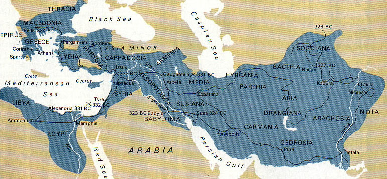 Alexander III (356 - 323 BCE) was tutored by Aristotle about greek culture and learning. He was also ambitious, daring commander and master of military strategy. In 338 BCE at the age of seventeen, he won a decisive battle at Cheronea to defeat Athenians and their allies showing brilliance of his leadership. In 336 BCE at the age of twenty one, he succeeded his father as the King of the Greek Empire. He invaded and conquered Persian Empire by 331 BCE to fulfill his father's dream of freeing Ionian Greeks from Persian domination. He conquered Egypt in 332 BCE and marched across asia to the north east of India. He conquered a king ruling that part of India in 326 BCE. He reluctantly turned back from the pressure of his solders longing to go back to their homeland. He died in Babylon in 323 BCE at the age of thirty two from an infection and possibly typhoid fever resulting from a chest wound received in a battle.