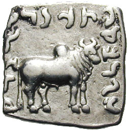 Reverse: Zebu bull standing with legend in Kharosti script.