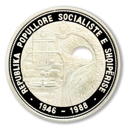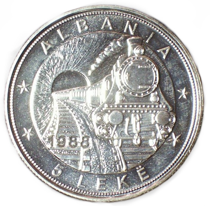 Obverse: A modern deisel engine train with Coat Arms of Albania