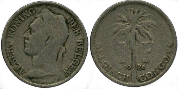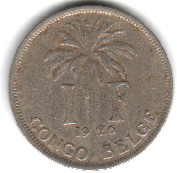 Reverse: Palm tree with legend 1 F, Belgian congo and year in numbers.