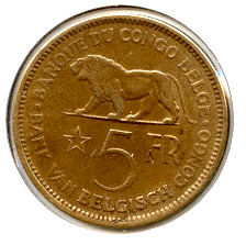 Reverse: Lion walking over 5 Fr with the legend 'Bank of Belgian Congo'