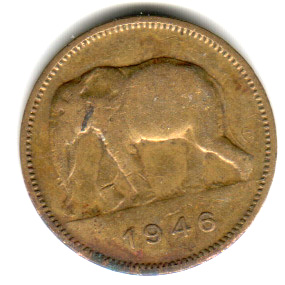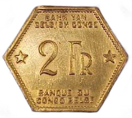 Reverse: 2 Fr in the center and the legend 'Bank of Belgian Congo'
