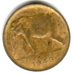 Reverse: 1 Fr in the center and the legend 'Bank of Belgian Congo'