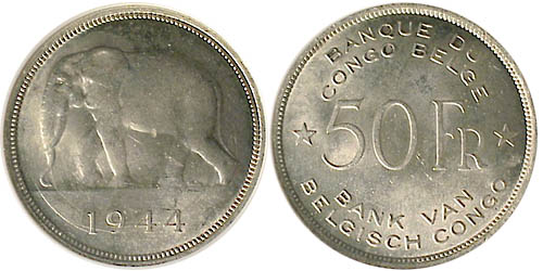 Reverse: 50 Fr in the center and the legend 'Bank of Belgian Congo'