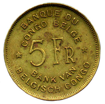 Reverse: 5 Fr in the center and the legend 'Bank of Belgian Congo'