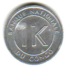 Reverse: 1 K surrounded by a legend ' National bank of Congo' in French.