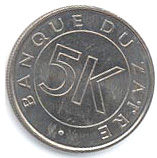 Reverse: 5 K surrounded by a legend ' Bank of Zaire' in French.