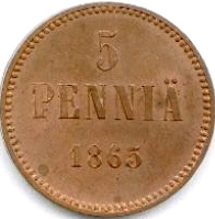 5 Penniä. Copper. 1864-71 CE.