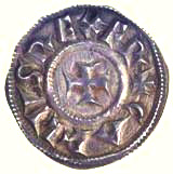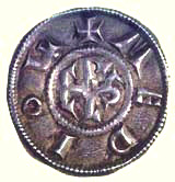Silver denier of Charlemagne. 771-793 CE. Obverse: Legend CAROLVS REX FR. (Charles, King of the Franks). Reverse: Legend MEDOL (Milan) Weight: ~1.7 grams.