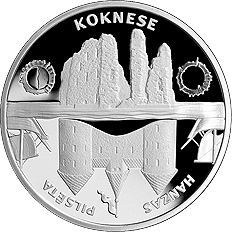 Reverse: Koknese castle ruins with the Sun and the Moon on the left and