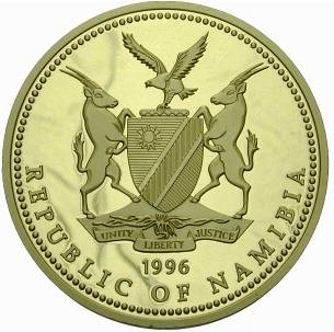 100 Dollars. K11 1996 Obverse: Namibian Coat of Arms. Reverse: Olympic games commemoration - Runner and cheetah.