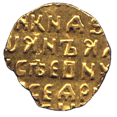 Gold Kopek novodel of Ivan V. Obverse: Knight on horseback . Reverse: Inscription in Cyrillic Weight: 0.45 grams. Diameter: 10millimeters. Reference: Schubert-98.