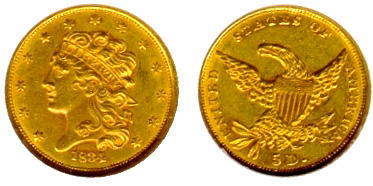 Gold 5 Dollars (Half Eagle) 1834-38.