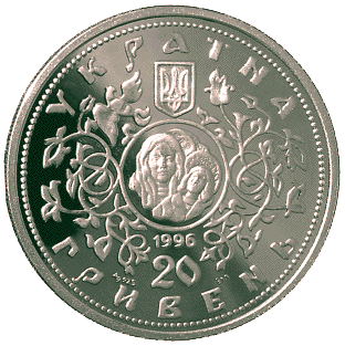 Reverse: Ukranian national symbol at the top, Mother Odyhitriya with a